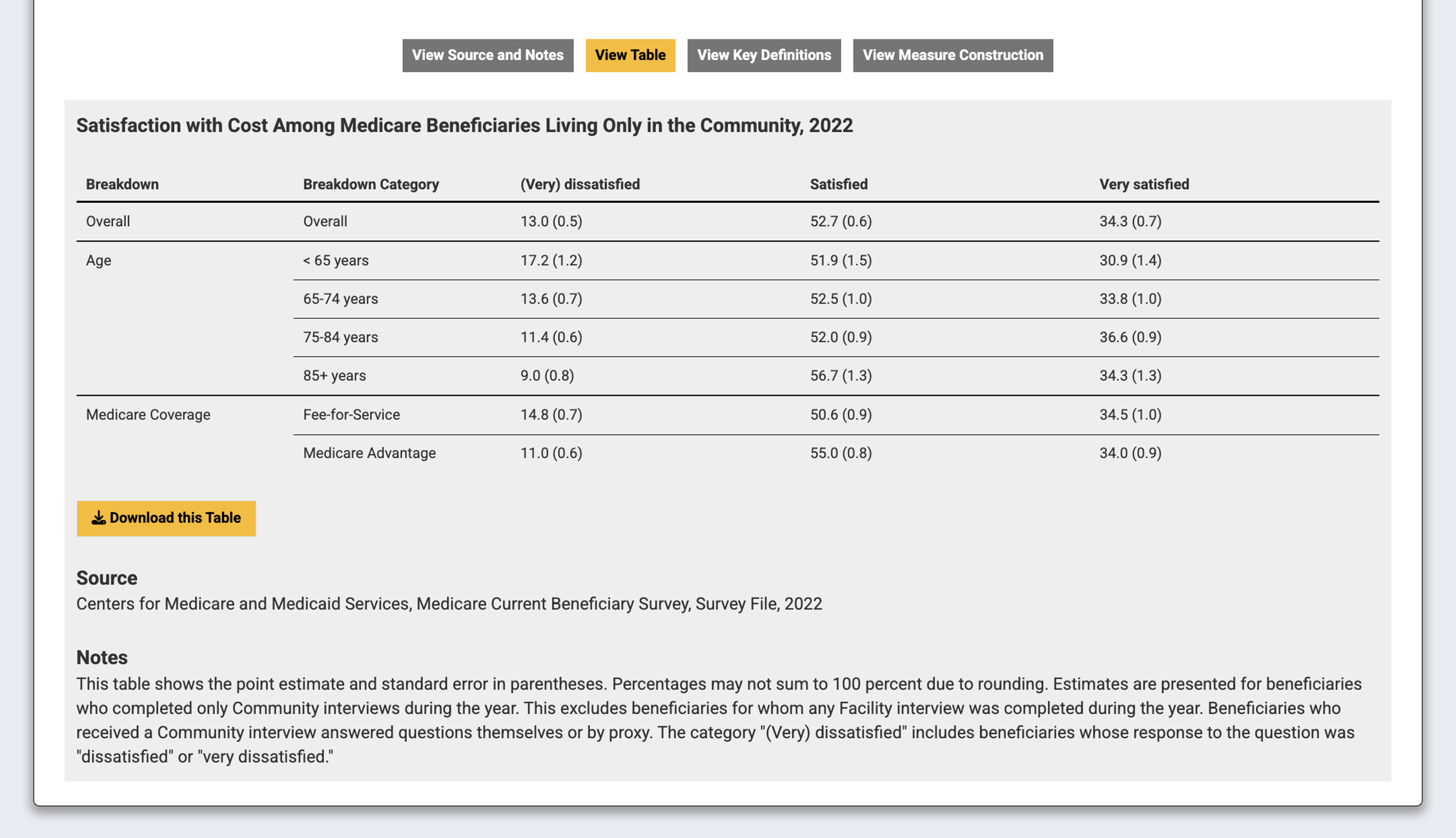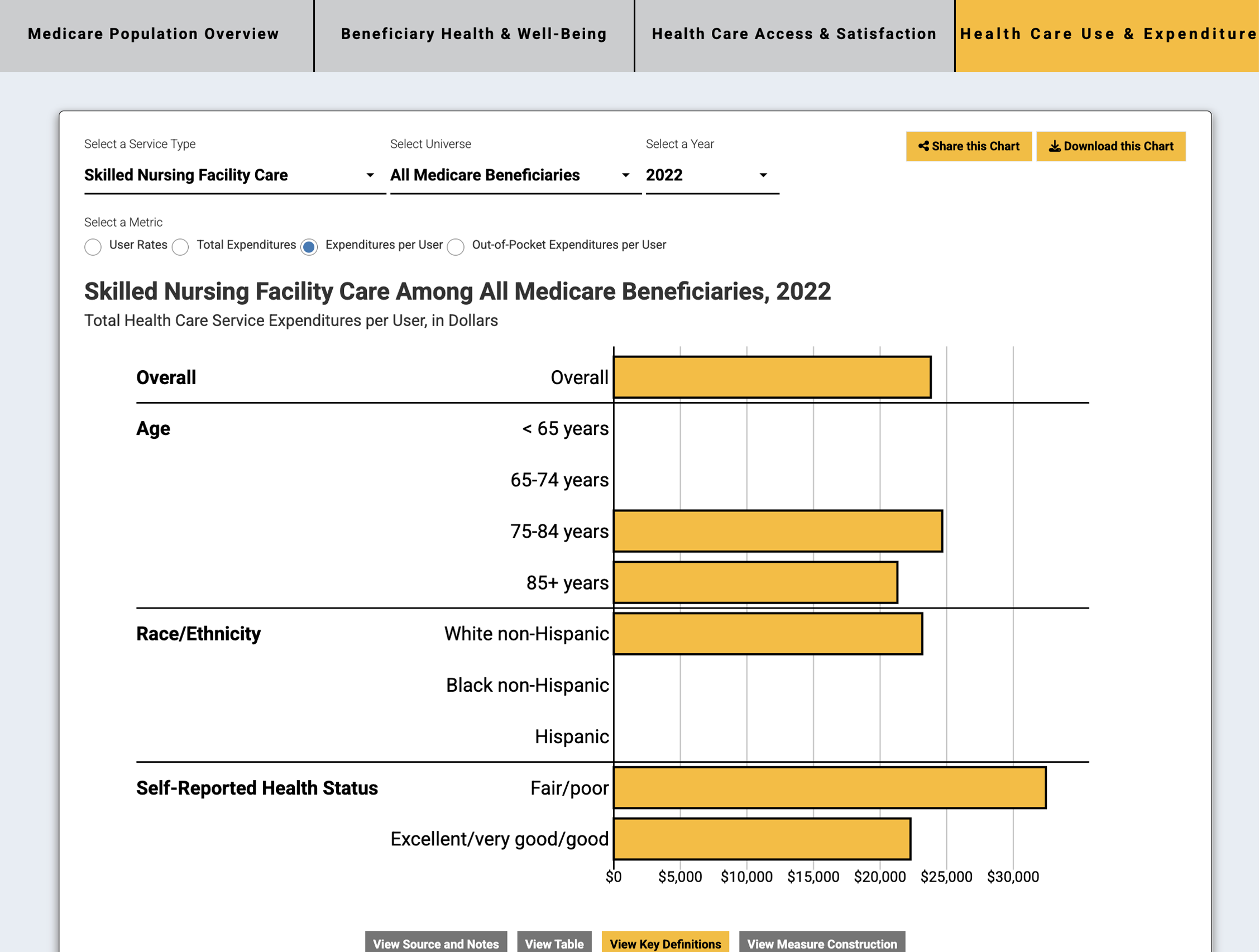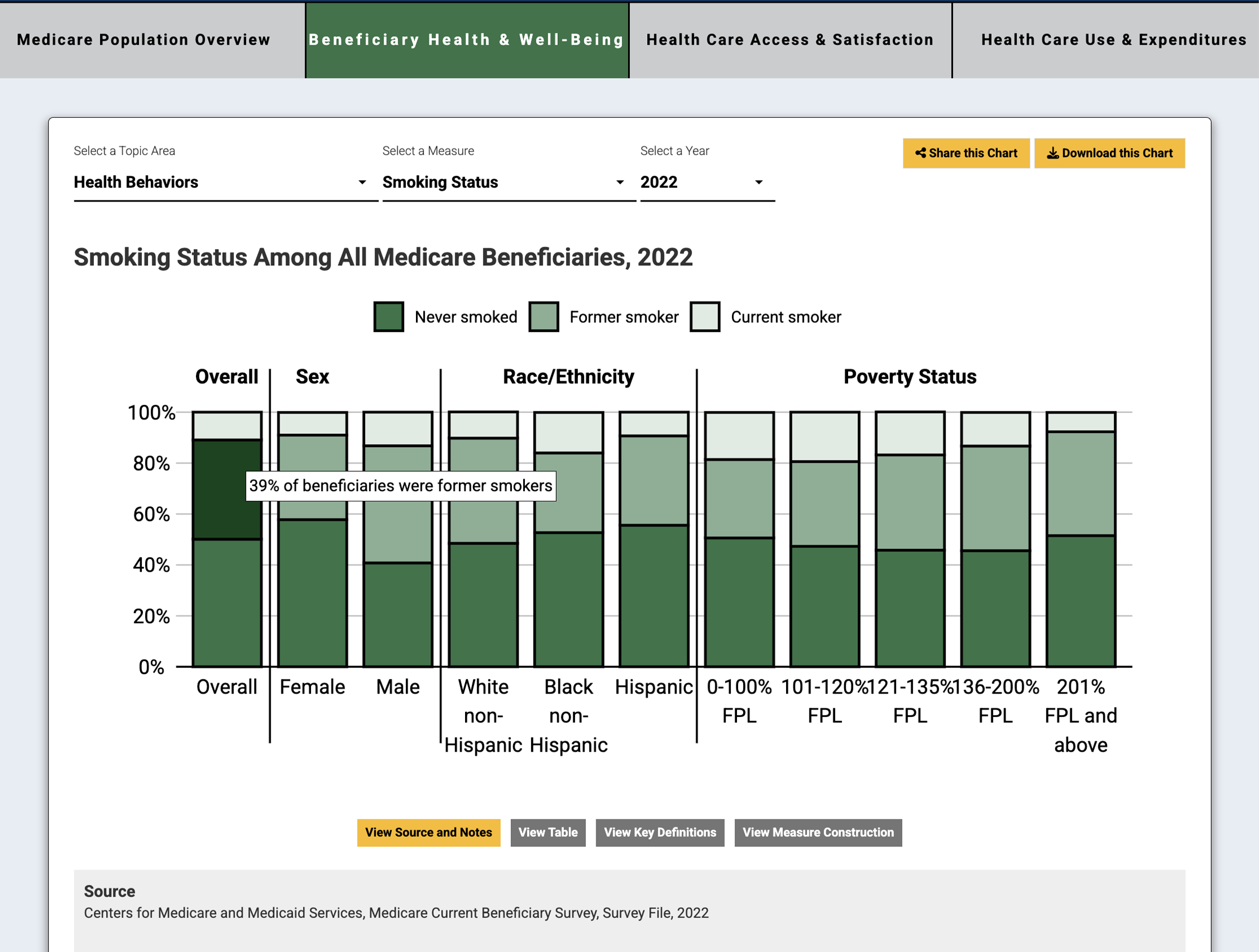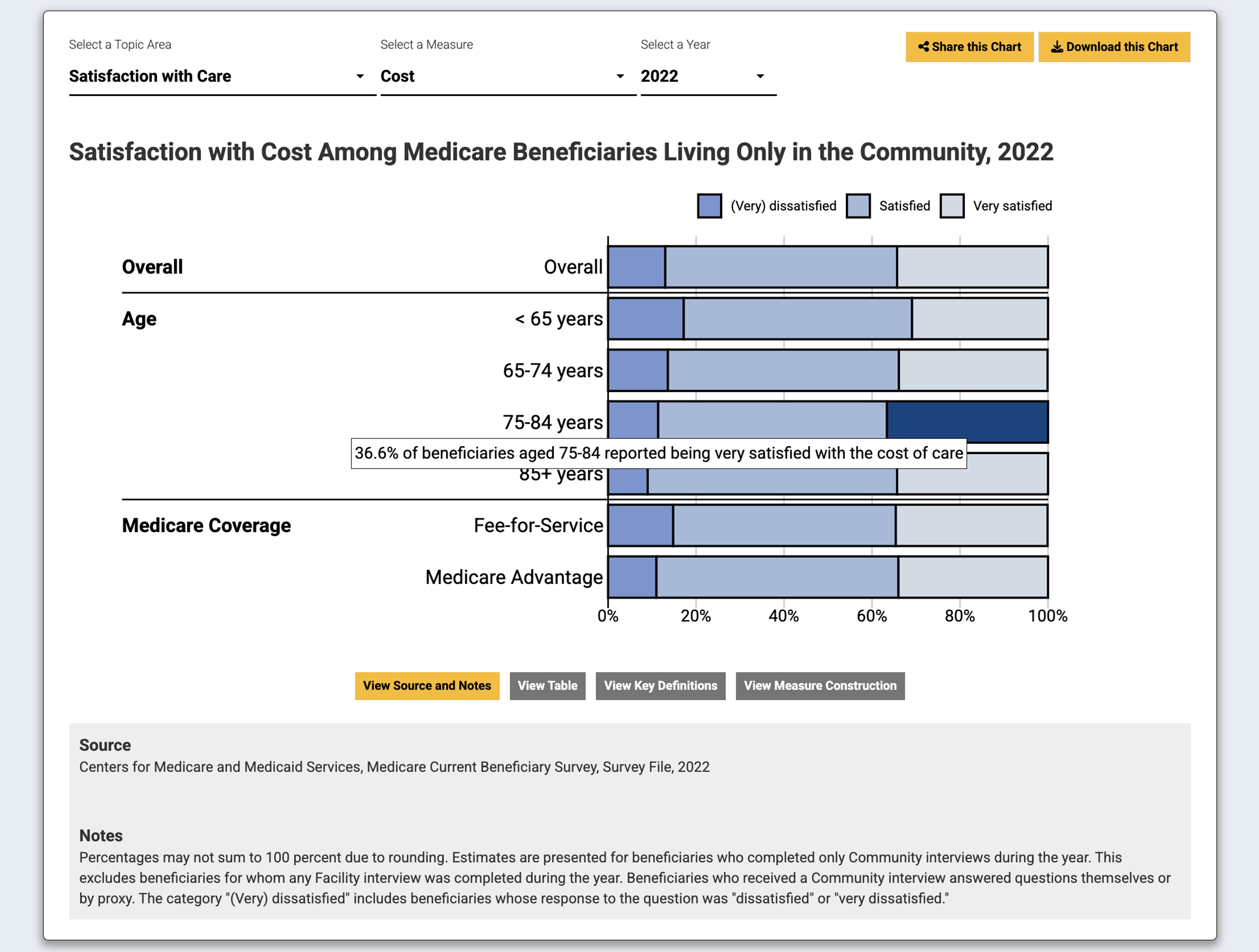 Each interactive chart included information on the source MCBS data file, interpretive notes, and detailed definitions and measure construction details. The site featured rich interactivity, including the ability to share and download individual charts and tables, interactive hover-overs with data point interpretations, and a comprehensive “About” page with methodology, relevant resources, and user guides.