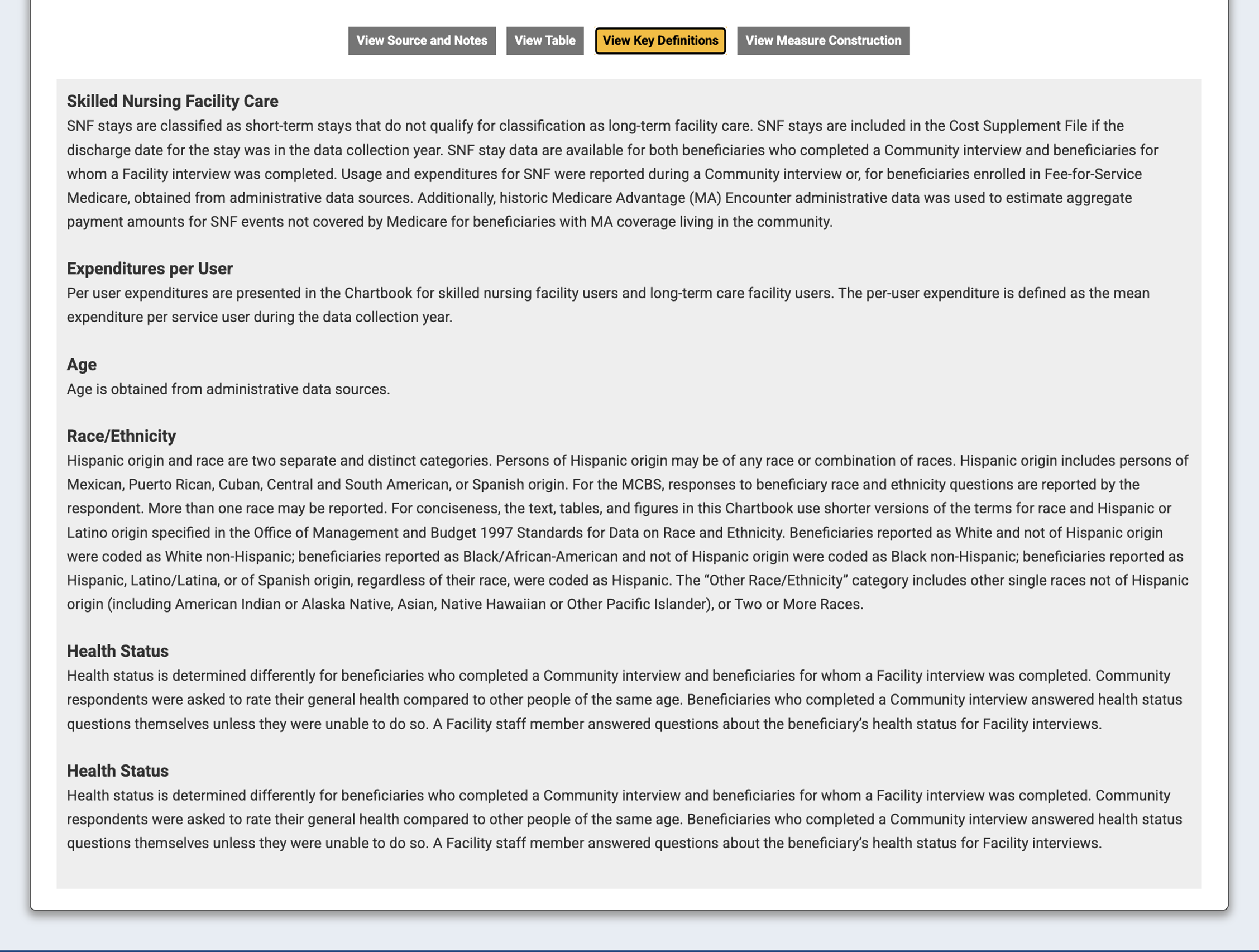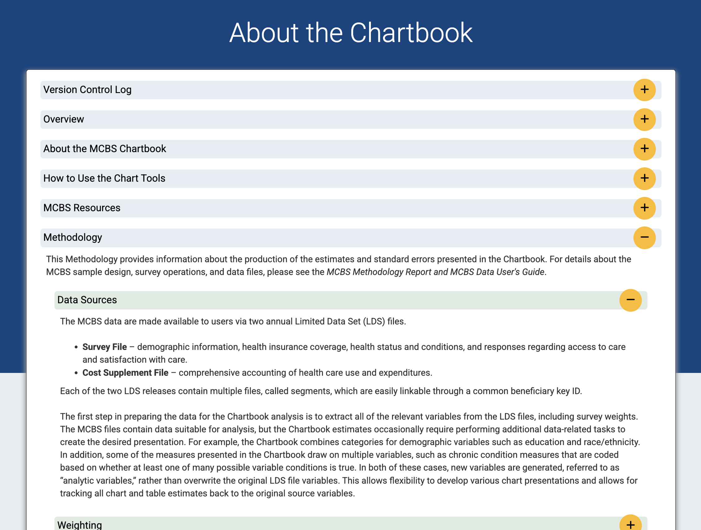 Beginning with the release of 2021 MCBS data, the online MCBS Chartbook replaced the PDF version that had been updated and released annually on the CMS MCBS website. The MCBS Chartbook website was decommissioned in January 2026 as MCBS data tools and systems were migrated to CMS servers.