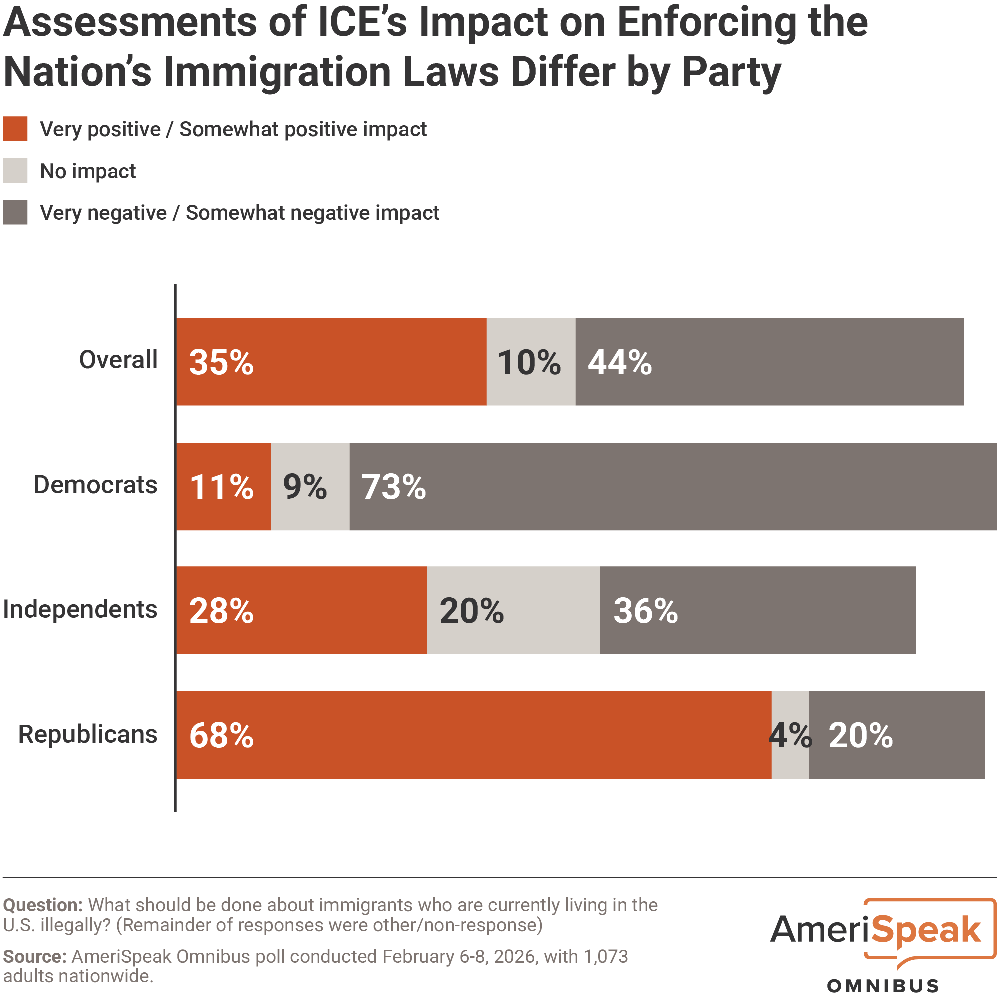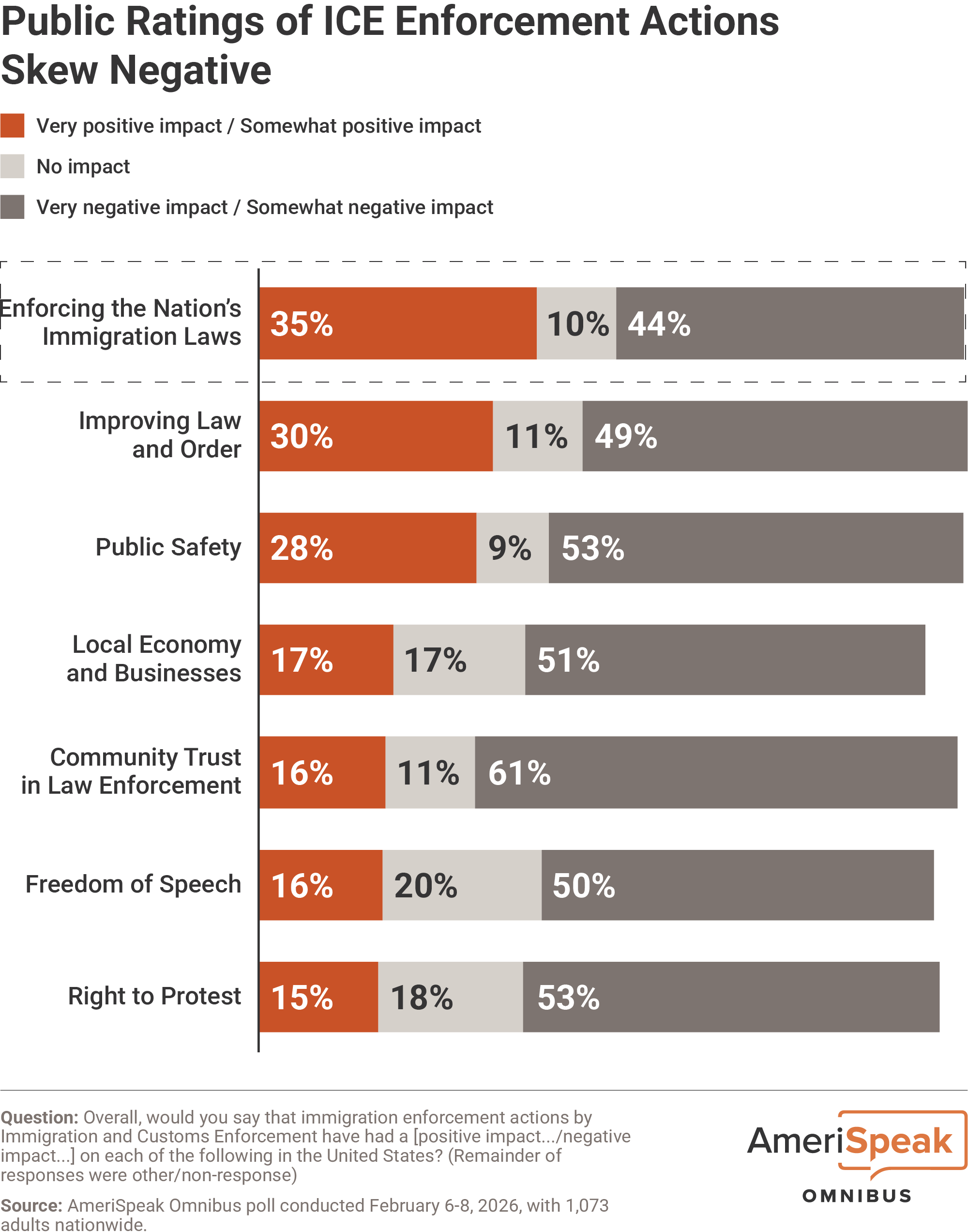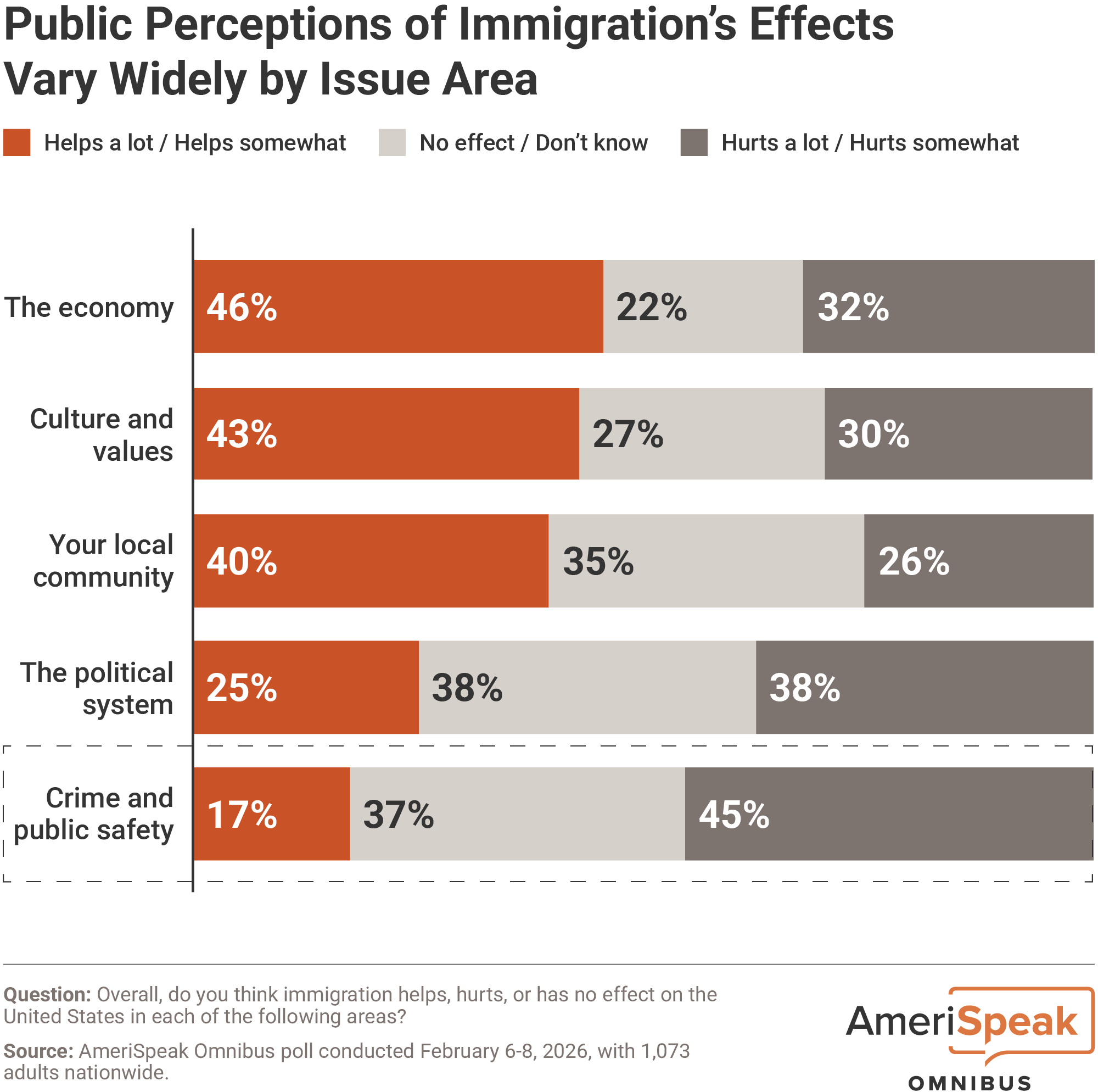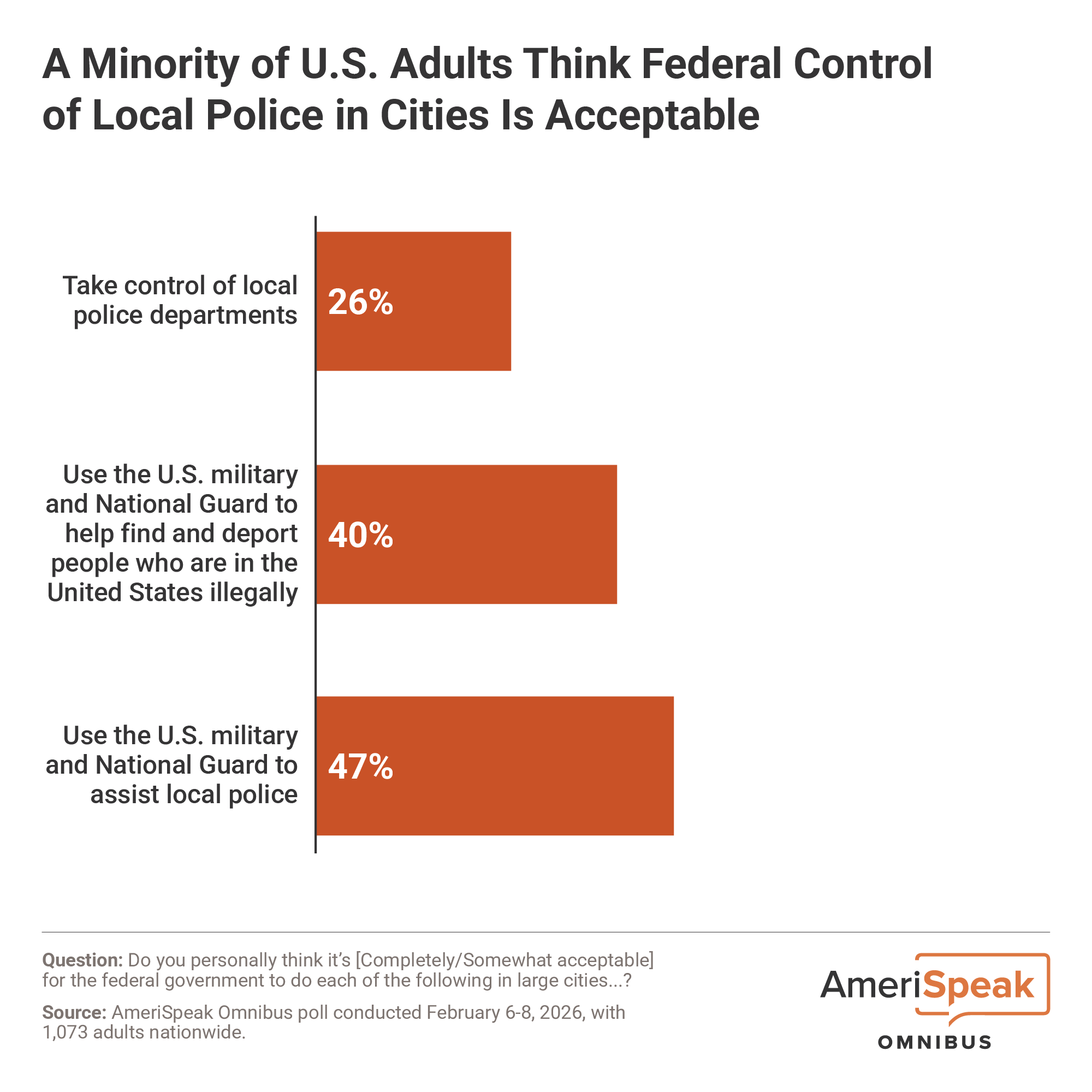 A poll of 1,073 American adults was conducted between February 6-8, 2026, using the AmeriSpeak® Omnibus, a bi-monthly multi-client survey using the AmeriSpeak panel, NORC’s probability-based panel that is designed to be representative of the U.S. household population. The margin of error is +/- 4.0 percentage points at the 95 percent confidence level, including the design effect. View the full methodology in the Transparency Report.
